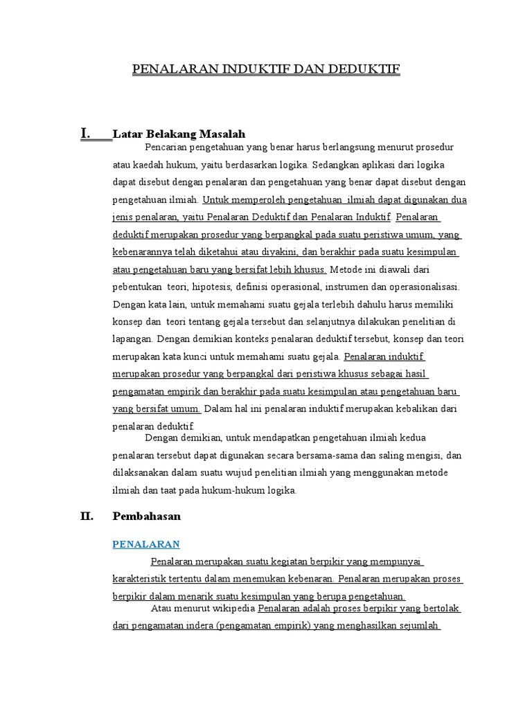 Penalaran induktif diperoleh berdasarkan beberapa kasus spesifik yang menghasilkan kesimpulan yang umum. 2 penalaran induktif menurut shurter dan pierce (dalam shofiah, 2007: Penalaran induktif matematis mahasiswa pendidikan matematika universitas papua. Penalaran ilmiah pada hakikatnya merupakan gabungan dari penalaran deduktif dan induktif. Argumen dalam penalaran induktif bisa kuat atau lemah. Makalah filsapat ilmu penalaran, logika, deduktif, induktif dan metode ilmiah pendahuluan filsafat adalah suatu cara berpikir yang radial dan menyeluruh, dengan cara. Proses berpikir tentang sesuatu, secara rasional, sehingga menarik kesimpulan yang valid, dikenal sebagai penalaran. Jika tidak ada makanan, manusia akan kelaparan. Harimau berdaun telinga berkembang biak dengan melahirkan. Penalaran induktif penalaran induktif merupakan pr#sedur yang berpangkal dari peristi%a khusus sebagai hasil pengamatan empirik aspek dari penalaran induktif adalah anal#gi dan generalisasi. Dimana lebih lanjut penalaran deduktif terkait dengan rasionalisme dan penalaran induktif dengan empirisme. Generalisasi generalisasi adalah proses penalaran yang bertolak dari fenomena individual menuju kesimpulan umum. Penalaran induktif dan deduktif i.